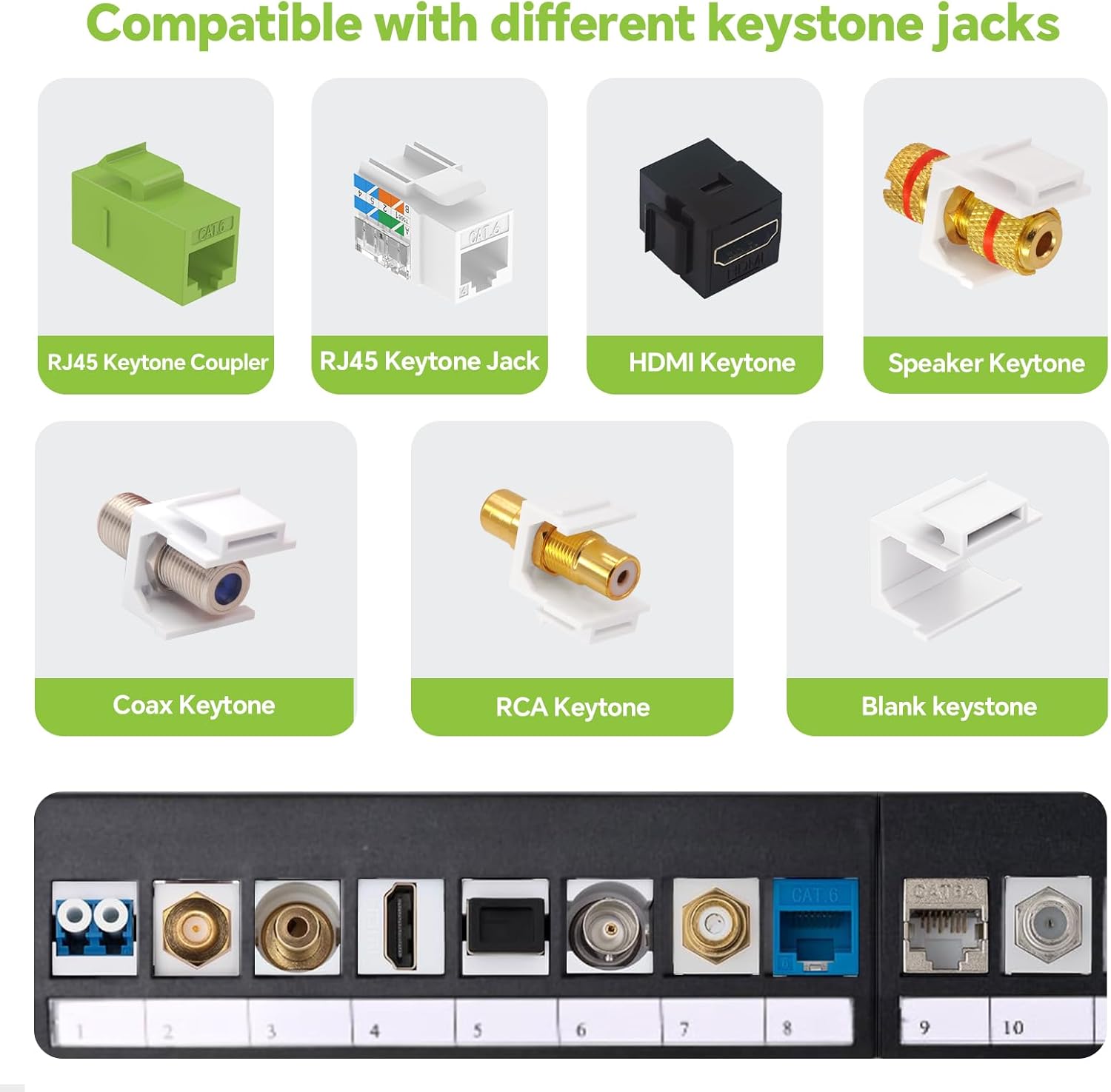• Accepts multiple keystone types, including RJ45 Ethernet, RCA, HDMI, fiber, speaker, and coaxial modules