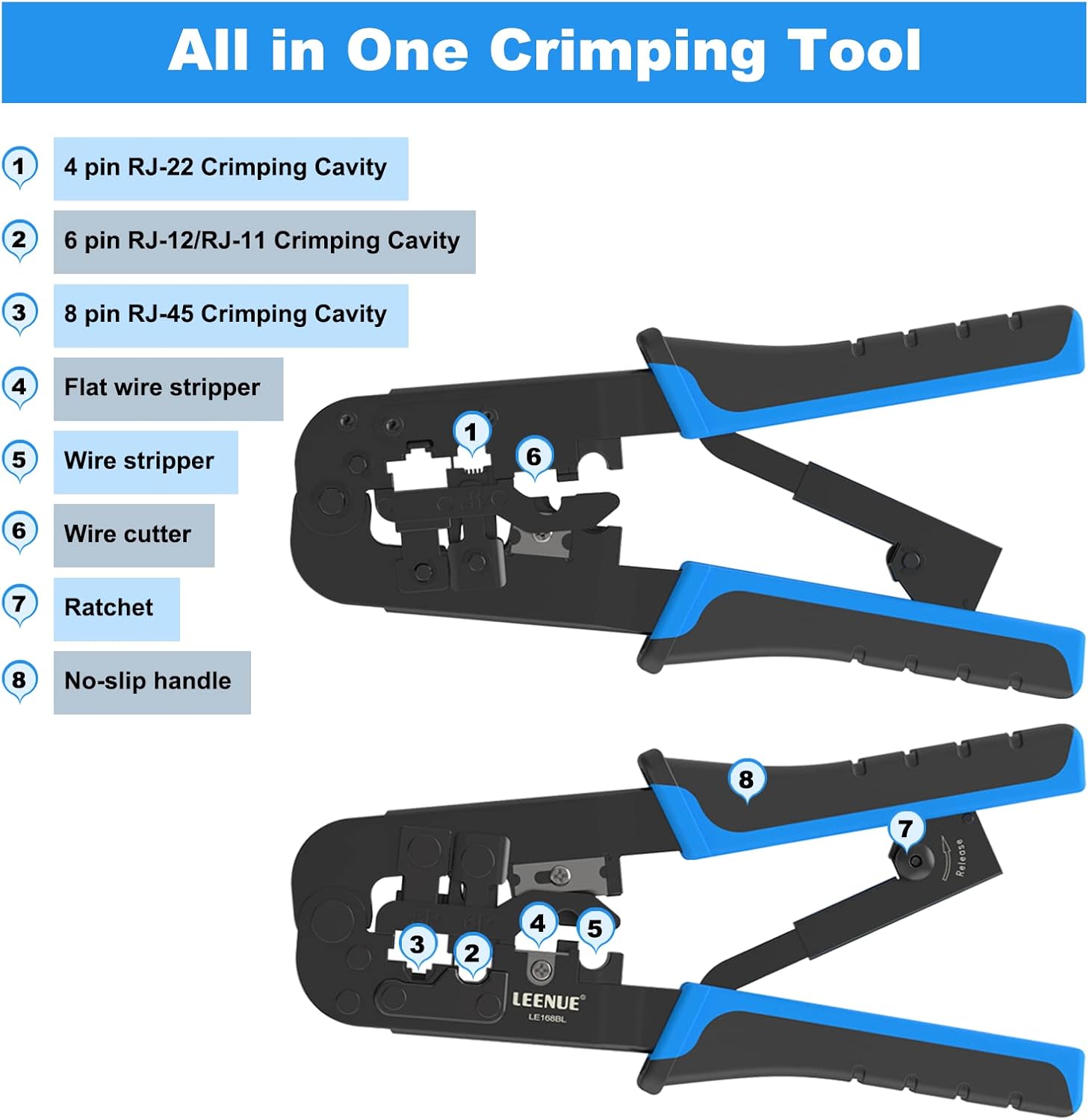 • Supports cutting, stripping and crimping for Cat6a, Cat6, Cat5e and Cat5 network cables